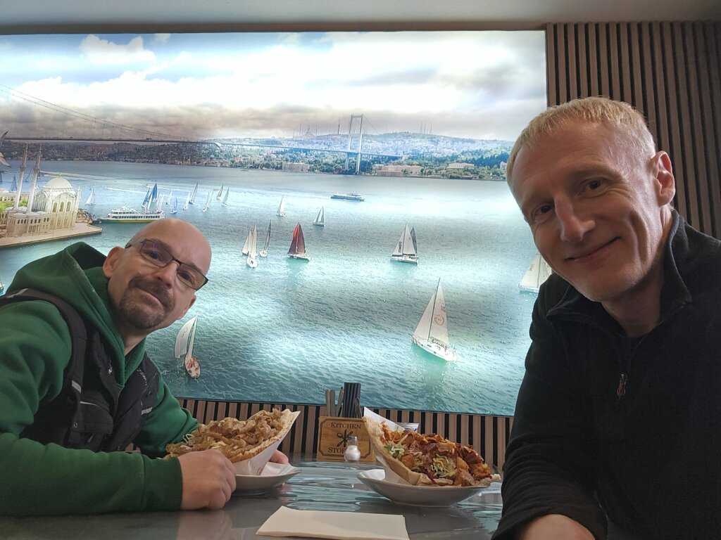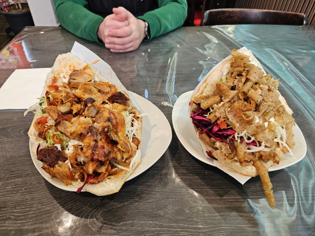 Wir bestellen zwei Döner, ich einen mit Chicken Kräuter und leicht scharf, Sam nimmt Kalbfleisch mit Knoblauchsoße. Der Döner besteht aus einem Viertelfladen, nicht getoastet, weich und lecker, die Soßen werden auf das Brot gestrichen und schmecken uns. Angenehme Schärfe auch.