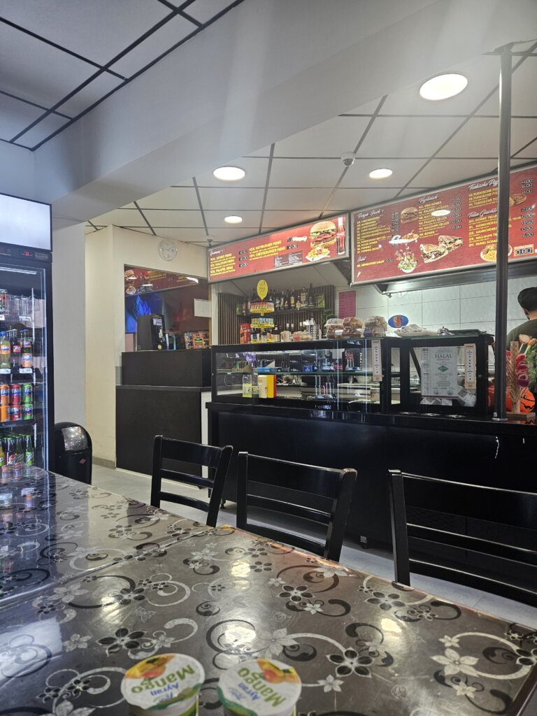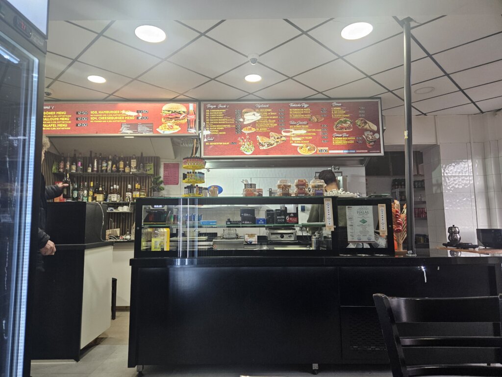 Der junge Dönermann empfängt mich etwas konsterniert, aber durchaus freundlich und nimmt zügig meine Bestellung auf. Er ist leicht überrascht, dass ich „zum hier essen“ bestelle. Der Laden ist runter gerockt, aber sauber und bietet nicht nur im Raucherraum ausreichend Sitzplätze mit schönem 90er Feeling. Ich teile mir die Kunstledersitzbänk in Bordeaux mit zwei Jungs, die nach der Schule was zu Mittag essen wollen. Schön!