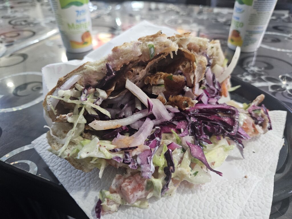 Ich bestelle einen Döner mit Kräuter, komplett und bisschen scharf. Der klassische Viertelfladen ist üppig gefüllt. Die wissen genau, was ihre Kunden hier erwarten und liefern. Viel hilft viel. Der Salat aus Eisbergsalat, Rotkohl, Gurken-Tomate-Mix und zahlreichen Zwiebeln ist frisch und gut. Also okay. Die Kräutersoße bindet, die scharfe Soße macht ein bisschen Feuer und das Fleisch vom Kalbshackfleischspieß wert gut gegrillt und tatsächlich schön dünn geschnitten. Es schmeckt erwartbar, ist aber heiß.