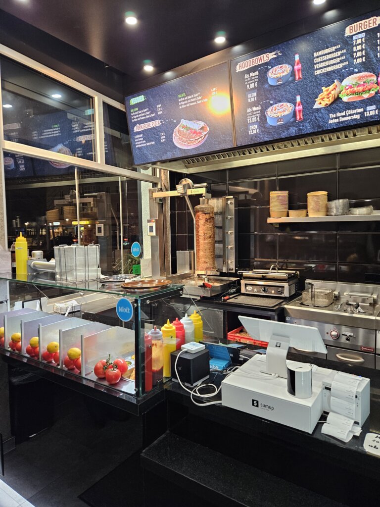 Gemeinsam mit Gasttester Sebastian schauen wir uns nach Sitzplätzen um und stellen fest: Fehlanzeige. Bei Dönerhood gibt es innen leider nur Stehplätze. Die sind immerhin hübsch, sauber, und schön beleuchtet ist der Laden auch. Gut.