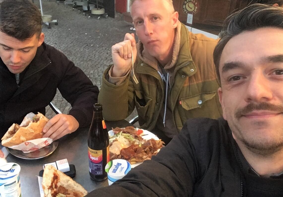 Die Jungs, nee, in diesem Fall muss man sagen: die netten Männer hinterm Tresen sind schnell und gut. Da geht´s zack-zack, was möchtest du Jimmy?, alles komplett?, hier deine Pommes. Allerdings können beide kein Französisch, so dass wir vom Dönerdate helfend einspringen müssen – so gut es eben geht. Denn bei einer Bestellung von einem „halben“ halben Hähnchen für eine Mitkundin versagen auch uns die Übersetzerkünste. Ergebnis für alle interessierten Leser: die Döneria verkauft keine „halben“ halben Hähnchen. Uns egal, denn wir sind für den Döner hier. Freudige Überraschung: wir bekommen heute weiteren Zuwachs von einem vierten Dönertester. Stefan taucht auf und macht das Quartett für heute voll.