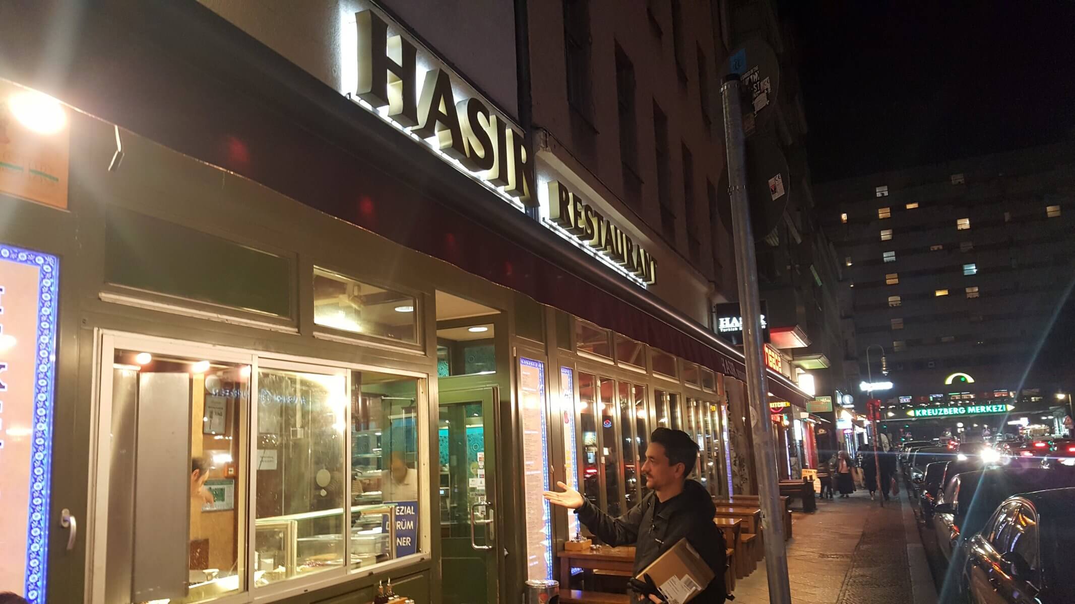 Hasir ist der Wallfahrtsort für jeden Dönerfreund. Wer hier den Boden küsst, scheint noch den Urdöner schmecken zu können. Angeblich sind Reste des ersten Döners noch in einem Schrein vorhanden, jedoch für die Öffentlichkeit unzugänglich. Dafür kann man bei Hasir sehr schön sitzen, drinnen wie draußen. Draußen nimmt man Teil an der brodelnden Kreuzberger Nacht, innen herrscht eine entspannte und lebendige Atmosphäre. Die Kellner sind gut gekleidet, gut frisiert und unaufgeregt. Wer keinen Döner bestellt, wird auch bedient. Döneresser wie wir, müssen sich das Produkt vorne an der Theke bestellen.