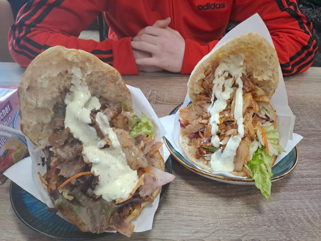 Wir bestellen zwei Döner komplett und mit Kräutersoße. Scharfe Soße fällt aus, dafür sprintet die Dönerfrau kurz zu uns zurück und bringt mir scharfes Pulver. Check.